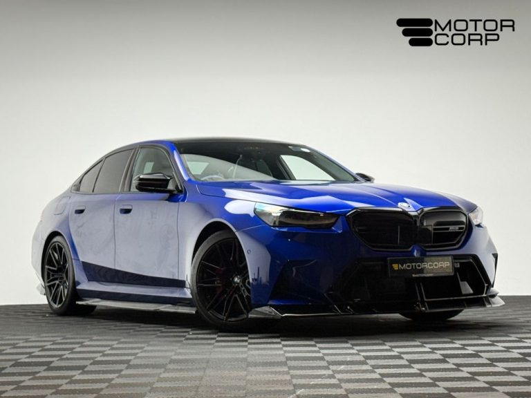 This 2025 BMW M5 finished in Marina Bay blue metallic with a full Silverstone / black Merino leather interior, comes equipped with: