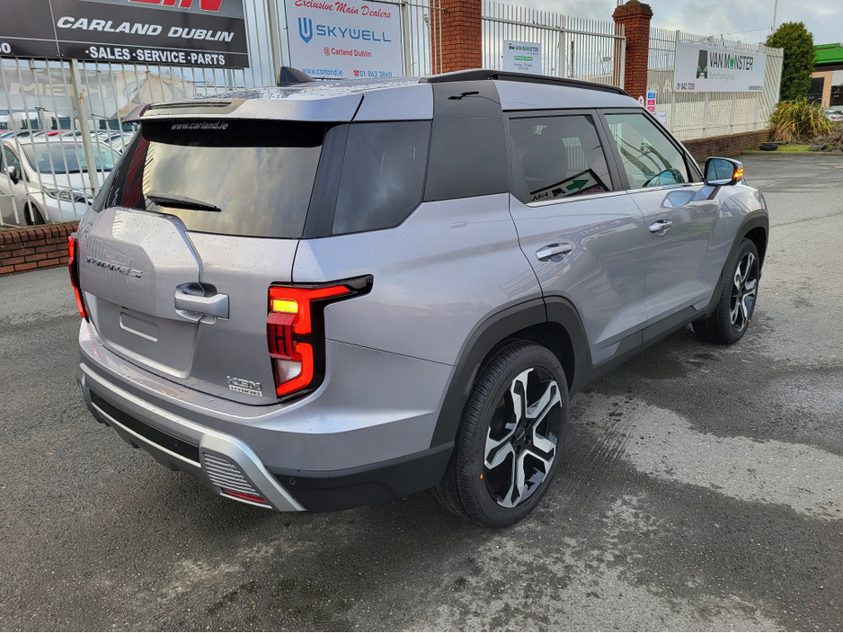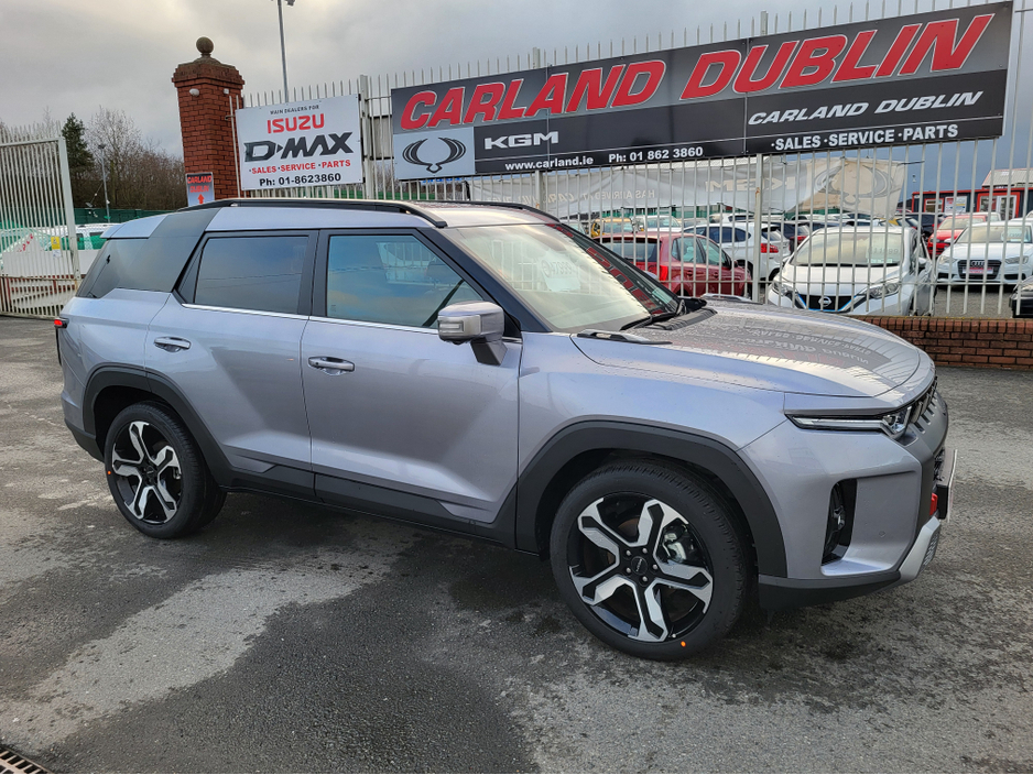 All new 2026 KGM Torres self charging Hybrid 1.5 petrol Automatic now available at Carland Dublin KGM With over 700 litres of boot space 20″ Alloys Nav 3d rear camera heated and vented seats heated steering wheel stunning new model finished in Iron metal metallic with black and rose gold interior..