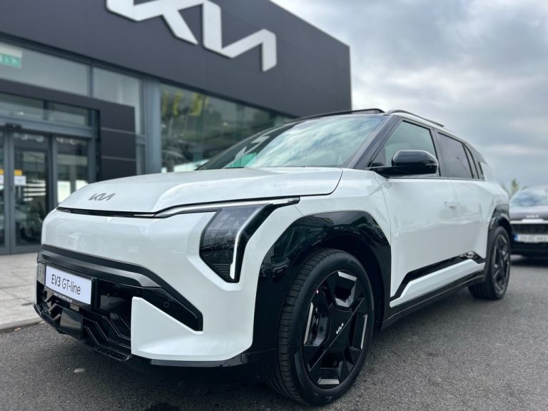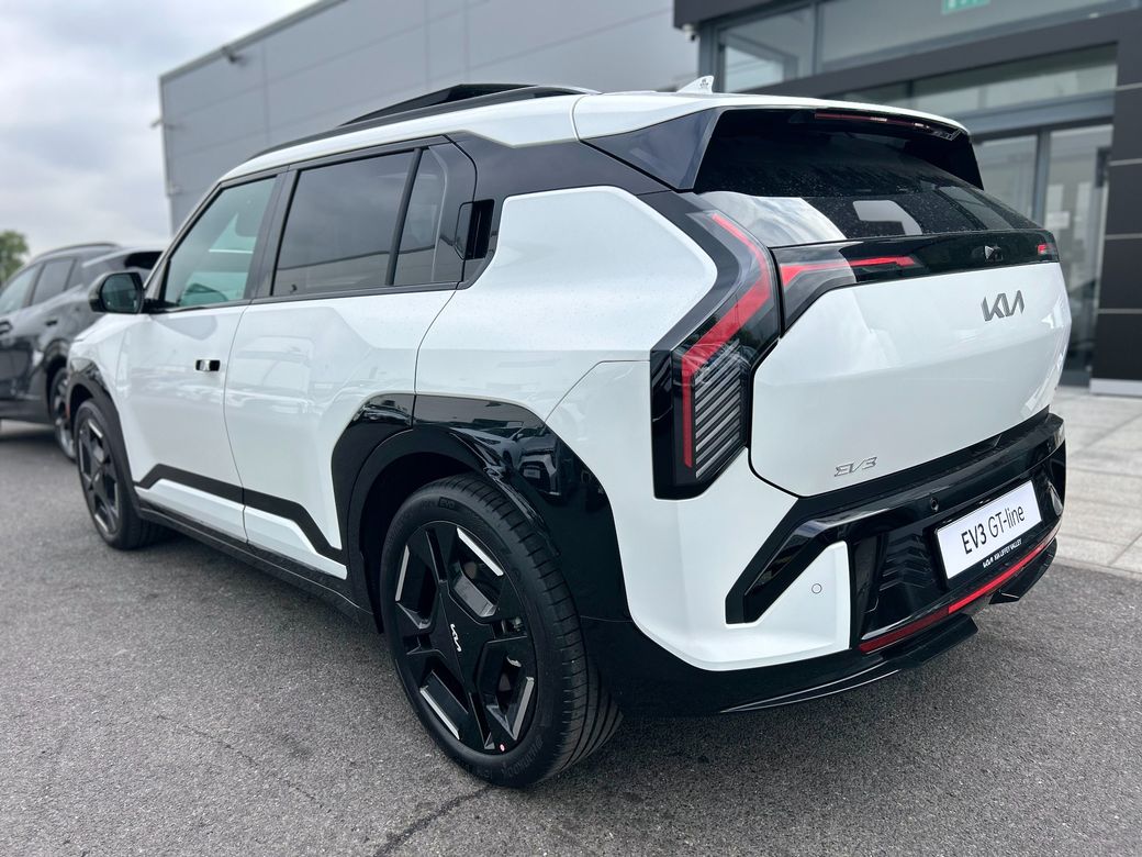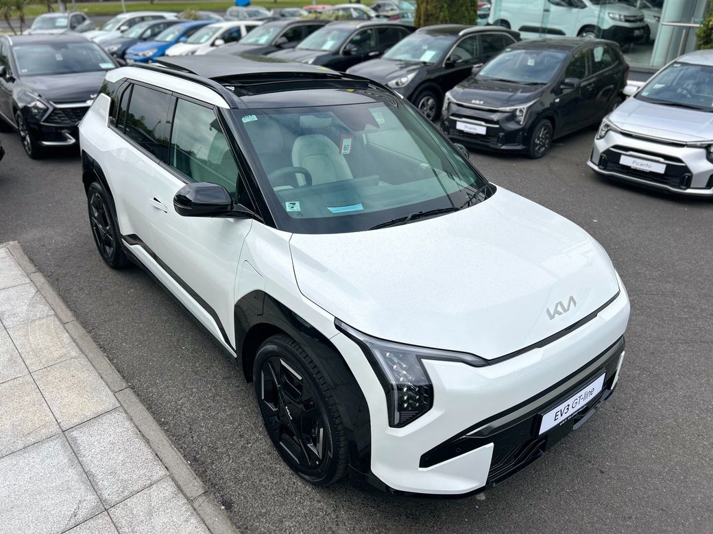 KIA EV3 GT Line, Finished in Snow White Pearl, Features include, 19″ GT Line Alloys, Electric tilt and slide sunroof, L.E.D projection headlights, GT Styling pack, Privacy rear glass, Front and rear sensors with reverse camera, Keyless entry with push button start, Vegan leather interior, Heated Seats front and rear, Heated steering wheel, Heated rear seats, Double 12.3 touchscreen displays, Android auto and apple car play, wireless phone charger, Digital key, Adaptive cruise control, Speed limit assist and lane keep assist, Blindspot monitor, Heat pump, 81.4KWh battery giving up to 585km range.