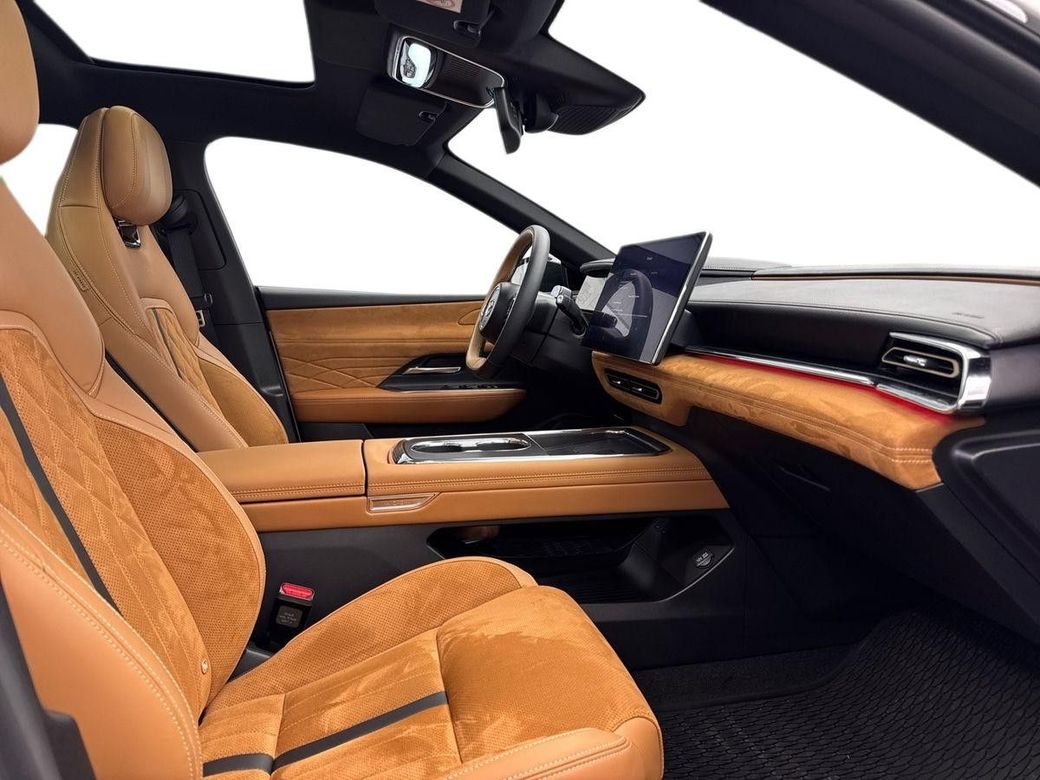 ILLUMINATED SIGNATURE WING • ELECTRIC TAILGATE • ELECTRIC REAR SPOILER • LED HEADLIGHTS WITH MANUAL HEADLIGHT RANGE ADJUSTMENT • LED REAR LIGHT WITH CONTINUOUS LIGHT STRIP • LOGIN: KEYLESS ACCESS SYSTEM • FRAMELESS DOORS WITH FLUSH DOOR HANDLES INTERIOR FEATURES • AMBIENT LIGHTING • ELECTRICALLY ADJUSTABLE PASSENGER SEAT, 4-WAY • ELECTRICALLY ADJUSTABLE DRIVER’S SEAT INCL. LUMBAR SUPPORT, 10-WAY, WITH MEMORY FUNCTION • STEERING WHEEL – FAUX LEATHER WITH DECORATIVE STITCHING • STEERING WHEEL HEATING • PANORAMIC GLASS ROOF, DARK TINTED, HEAT-REFLECTING • SEAT COVERS MADE OF BLACK OR WHITE SYNTHETIC LEATHER • SEAT HEATING AND SEAT AIR CONDITIONING, FRONT • TWO-ZONE AUTOMATIC CLIMATE CONTROL (TEMPERATURE FOR THE DRIVER AS WELL AS FOR THE FRONT PASSENGER AND THE SECOND ROW OF SEATS) SAFETY AND TECHNOLOGY • 9 AIRBAGS INCLUDING FRONT CENTRE AIRBAG • ISOFIX® CHILD SEAT MOUNT FOR THE PASSENGER SEAT AND THE OUTER SEATS OF THE 2ND ROW OF SEATS • REAR CROSS TRAFFIC COLLISION WARNING (RCTA) • FRONT COLLISION WARNING (FCW) • EMERGENCY BRAKE ASSISTANT AT THE REAR INCLUDING THE REAR CROSS TRAFFIC (SBS-RC) • LANE DEPARTURE WARNING WITH STEERING ASSISTANCE (LAS) AUDIO AND INFOTAINMENT • 14.6-INCH MULTIMEDIA TOUCH DISPLAY • GESTURE CONTROL, INCLUDING ANSWERING CALLS AND OPERATION OF THE AUDIO SYSTEM • HEAD-UP DISPLAY • QI: INDUCTIVE CHARGING WITH COOLING FUNCTION (FOR COMPATIBLE SMARTPHONES) • INTELLIGENT VEHICLE MODES: CAR WASH, LEAVING, RELAX, FRESH AIR, PRIVATE AND REST MODE • SONY® SOUND SYSTEM WITH 14 SPEAKERS INCL. SPEAKERS IN THE DRIVER’S HEADREST • SPEECH RECOGNITION IN 9 LANGUAGES: GERMAN, ENGLISH, FRENCH, ITALIAN, SPANISH, SWEDISH, DUTCH, NORWEGIAN, POLISH • CONTROL VIA APP: CHARGING, AIR CONDITIONING, DOOR LOCKING2) • WIRELESS APPLE CARPLAY® AND WIRELESS ANDROID AUTO™ 2) IN ADDITION TO TAKUMI TAKUMI PLUS INTERIOR FEATURES • DASHBOARD AND DOOR TRIM – VELOUR LEATHER IMITATION LIGHT BROWN WITH DECORATIVE STITCHING AND QUILTING • ROOF LINING – BLACK • DECOR IN BLACK WOOD REPRODUCTION • ELECTRIC SUN BLIND • STEERING WHEEL – LEATHER, TWO-TONE BLACK/LIGHT BROWN • AIR VENTS – TITANIUM-COLOURED • SEAT COVERS IN LIGHT BROWN, PART NAPPA LEATHER AND IMITATION SUEDE WITH QUILTING