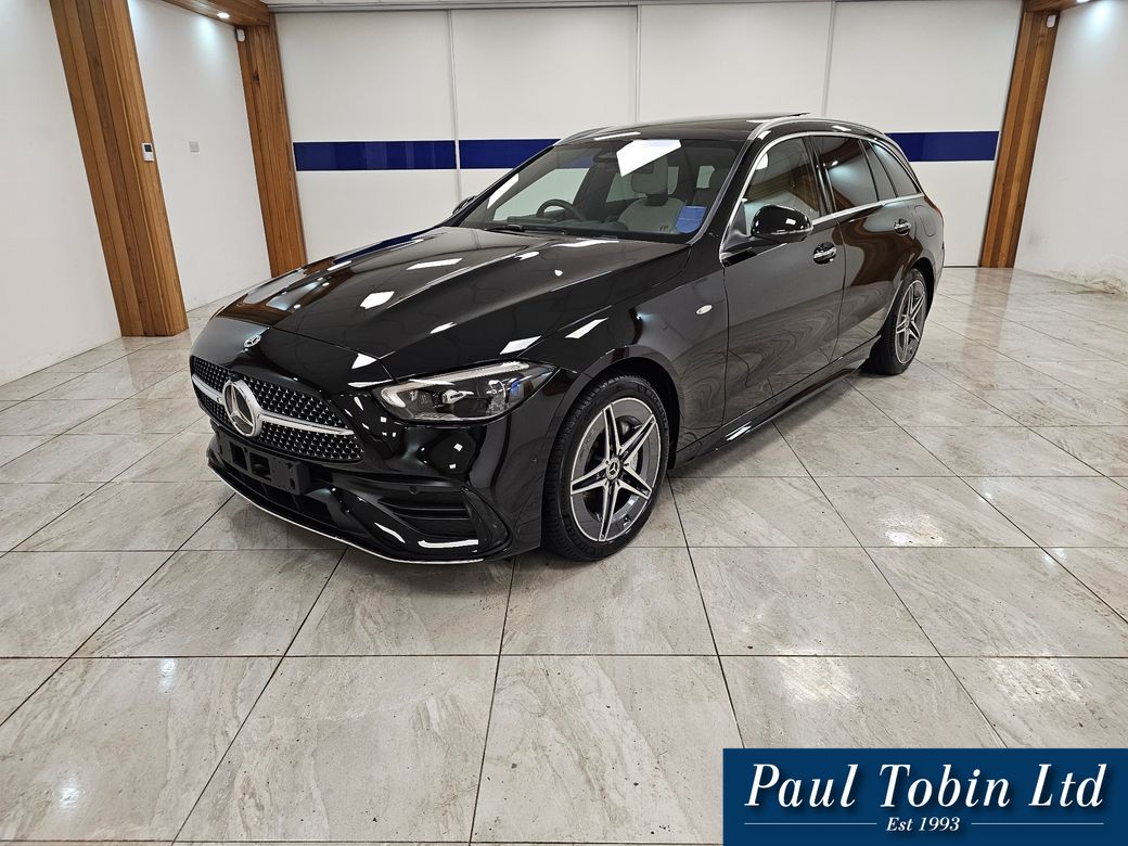 This is a 2025 Mercedes C 300e AMG line Premium in obsidian black metallic with a ivory cream leather interior